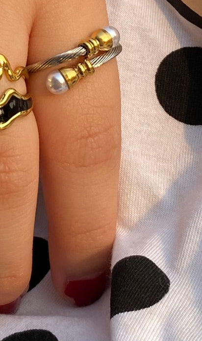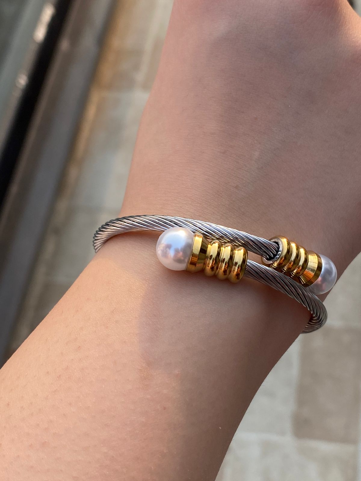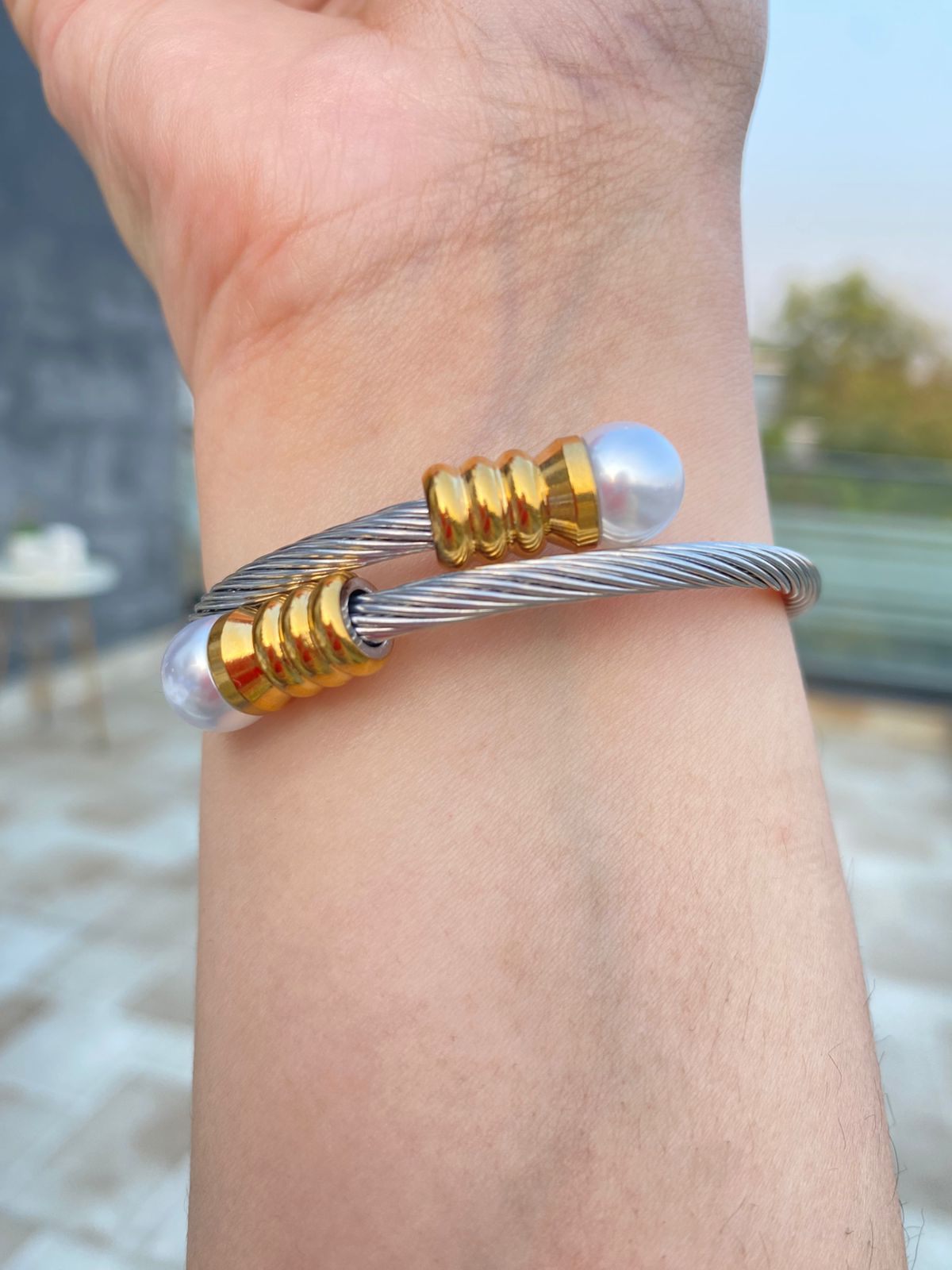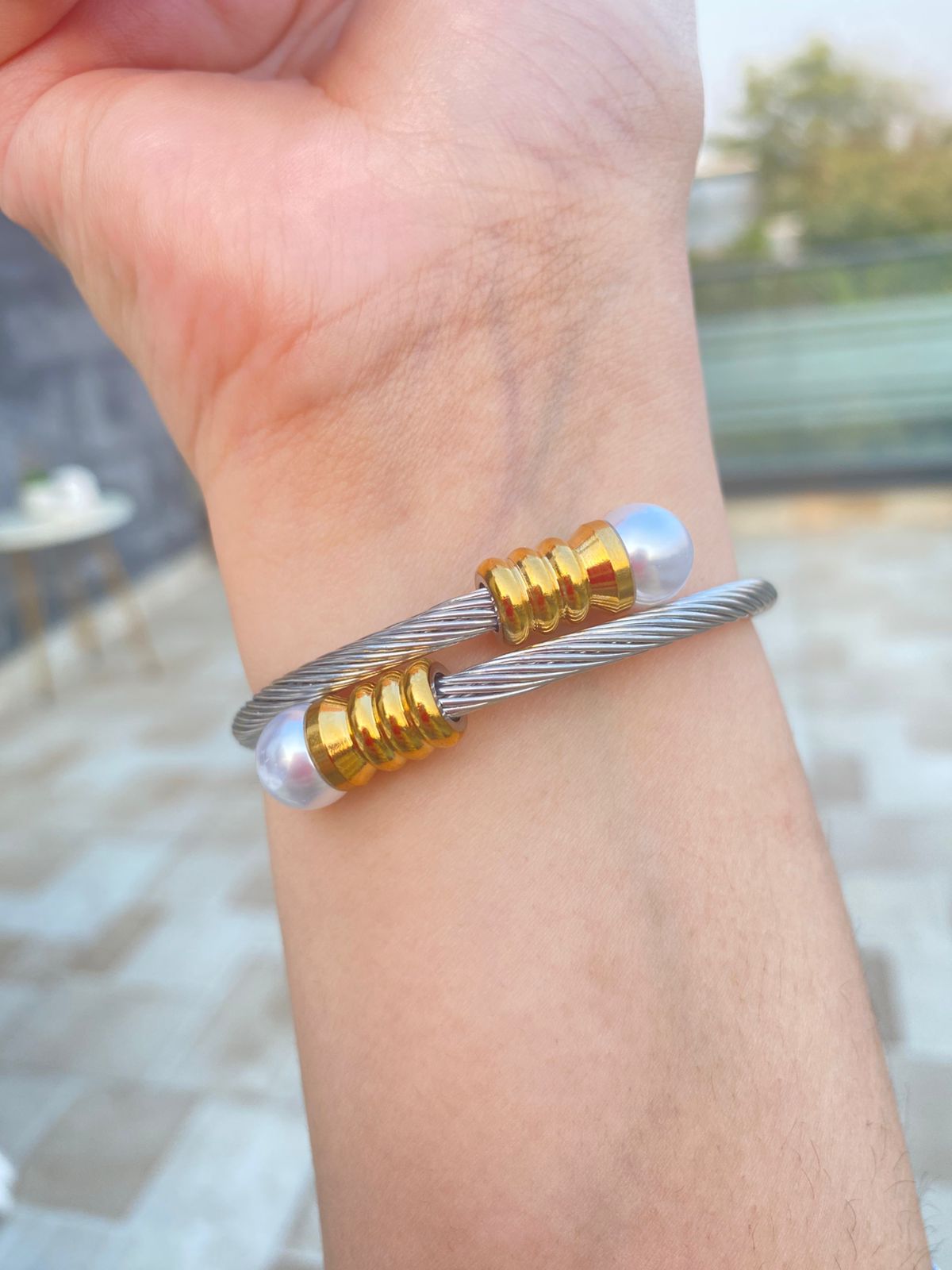 A Luxury Silver Aura Bangle Set with Freshwater Pearl Studded with 18k Gold Plated Finish✨️