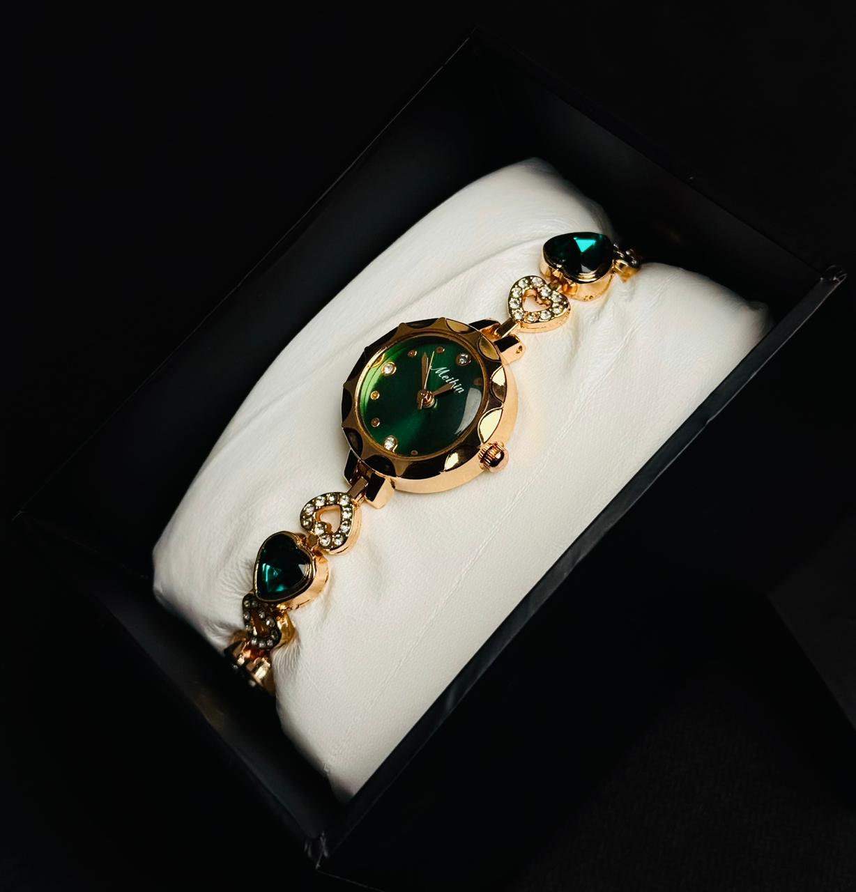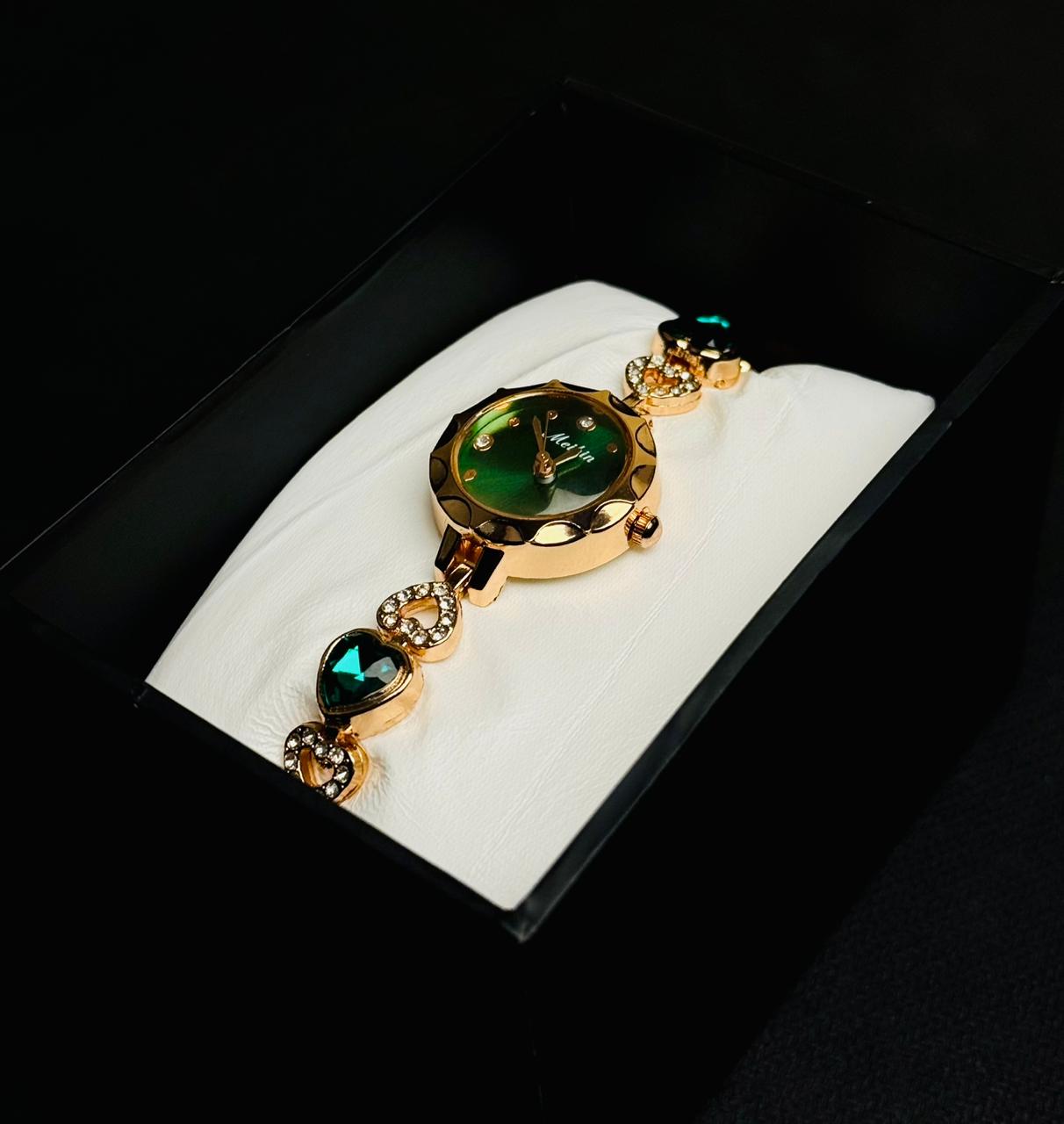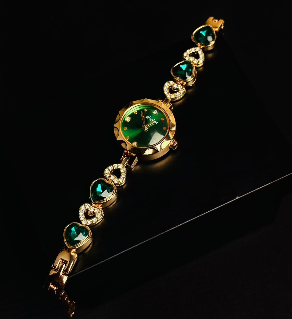 Step into the festive season with a timepiece that is a true investment in elegance. This luxurious watch is a masterpiece designed for grand formal events and celebrations. The vibrant emerald green dial, perfectly complemented by a radiant rose gold finish, exudes opulence and tradition. The thin, adjustable bracelet is beautifully adorned with heart-shaped emerald stones and delicate simulated diamond accents, making it feel less like a watch and more like a cherished heirloom bracelet. The Timepiece comes with A 2 Years Money Back Wear Warranty 💯 Premium Packaging 💯 Pure 22k Gold Plated 💯 Finest Glass Dial 💯 Easily Adjustable Straps for everyone 💯