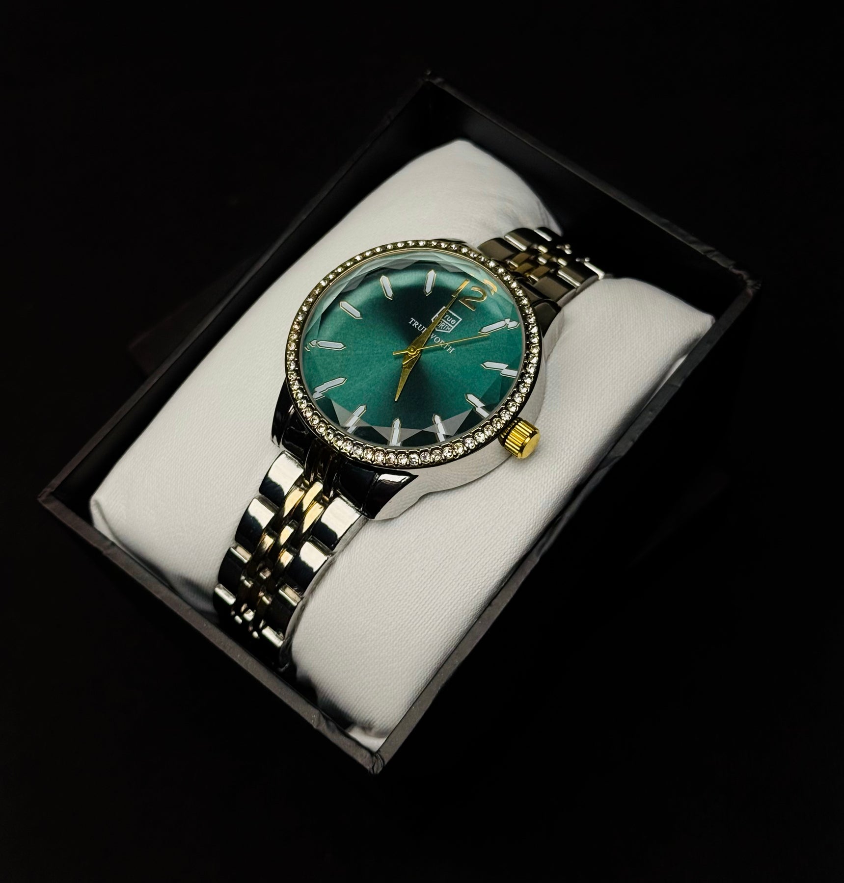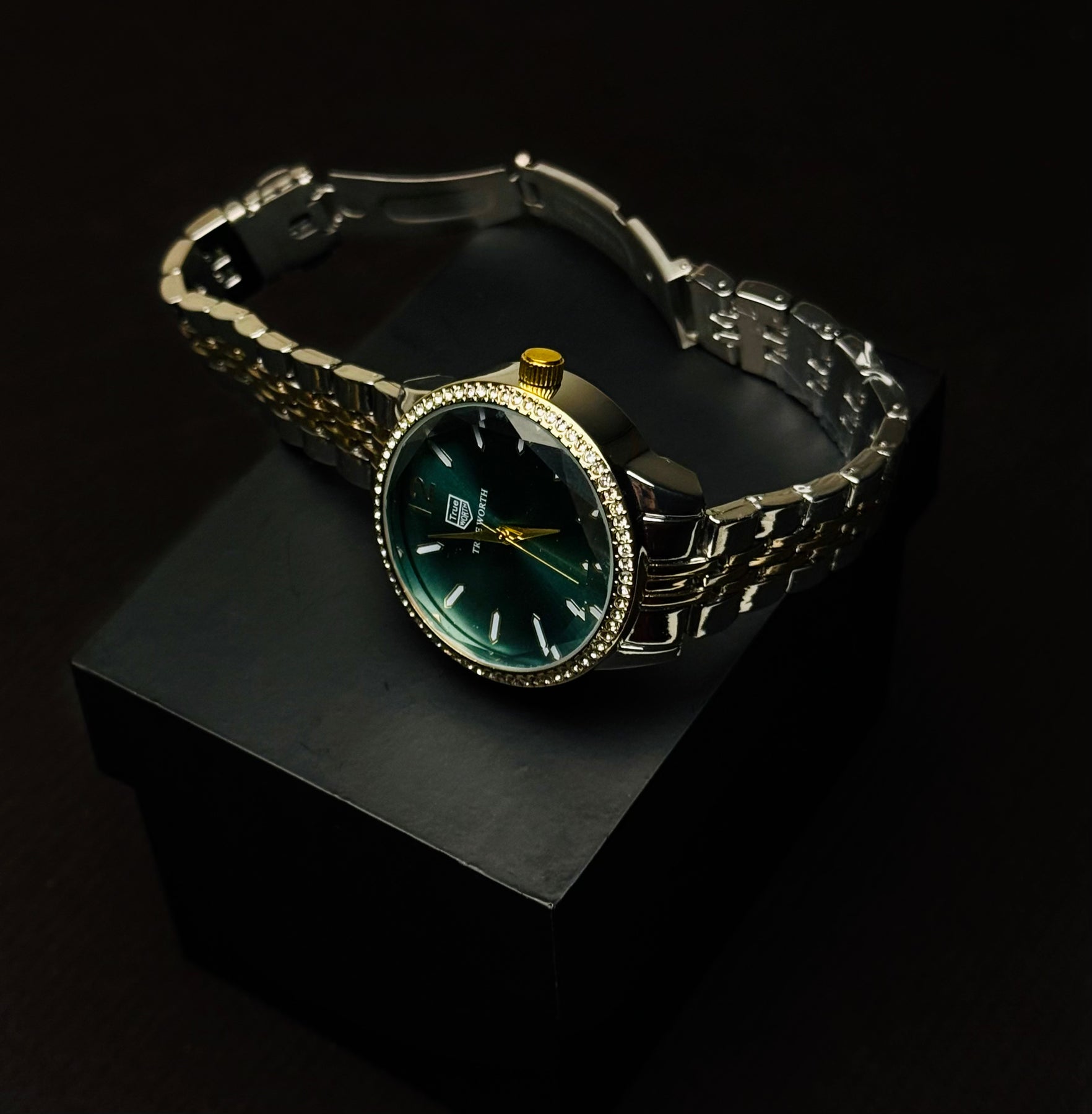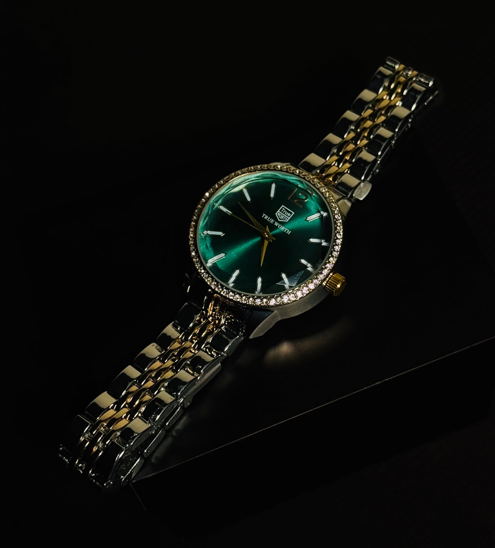 This watch features a mesmerizing emerald green dial that exudes depth and sophistication, reminiscent of precious jewels. This rich hue is beautifully framed by a radiant bezel lined with sparkling crystals, creating an enchanting halo effect. Completed with polished silver and warm 22k gold accents, this is your new signature timepiece. 🎀