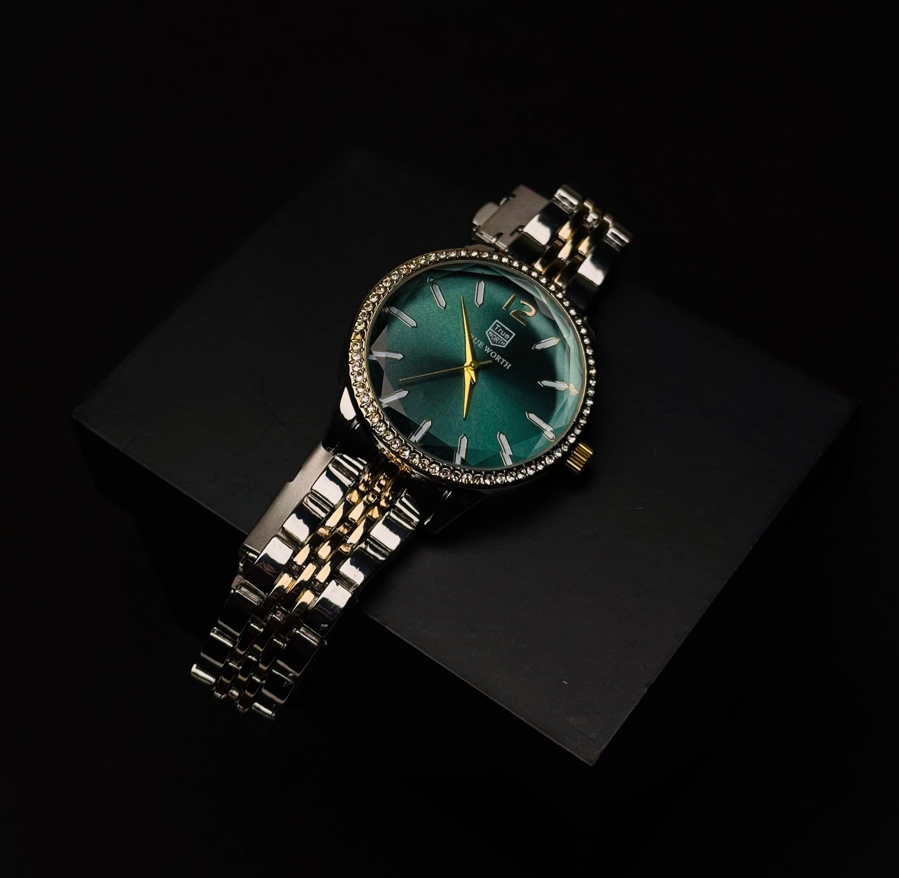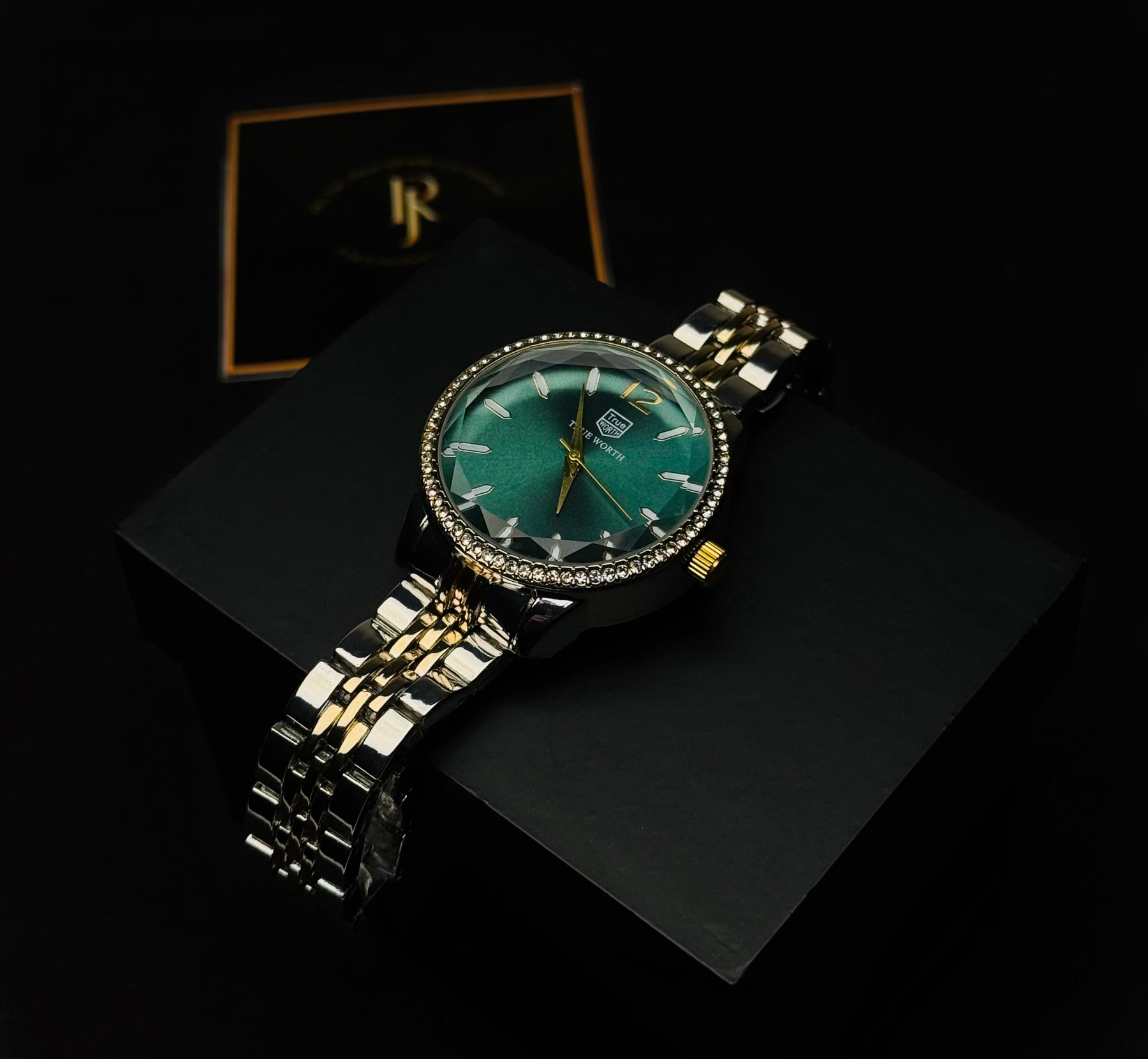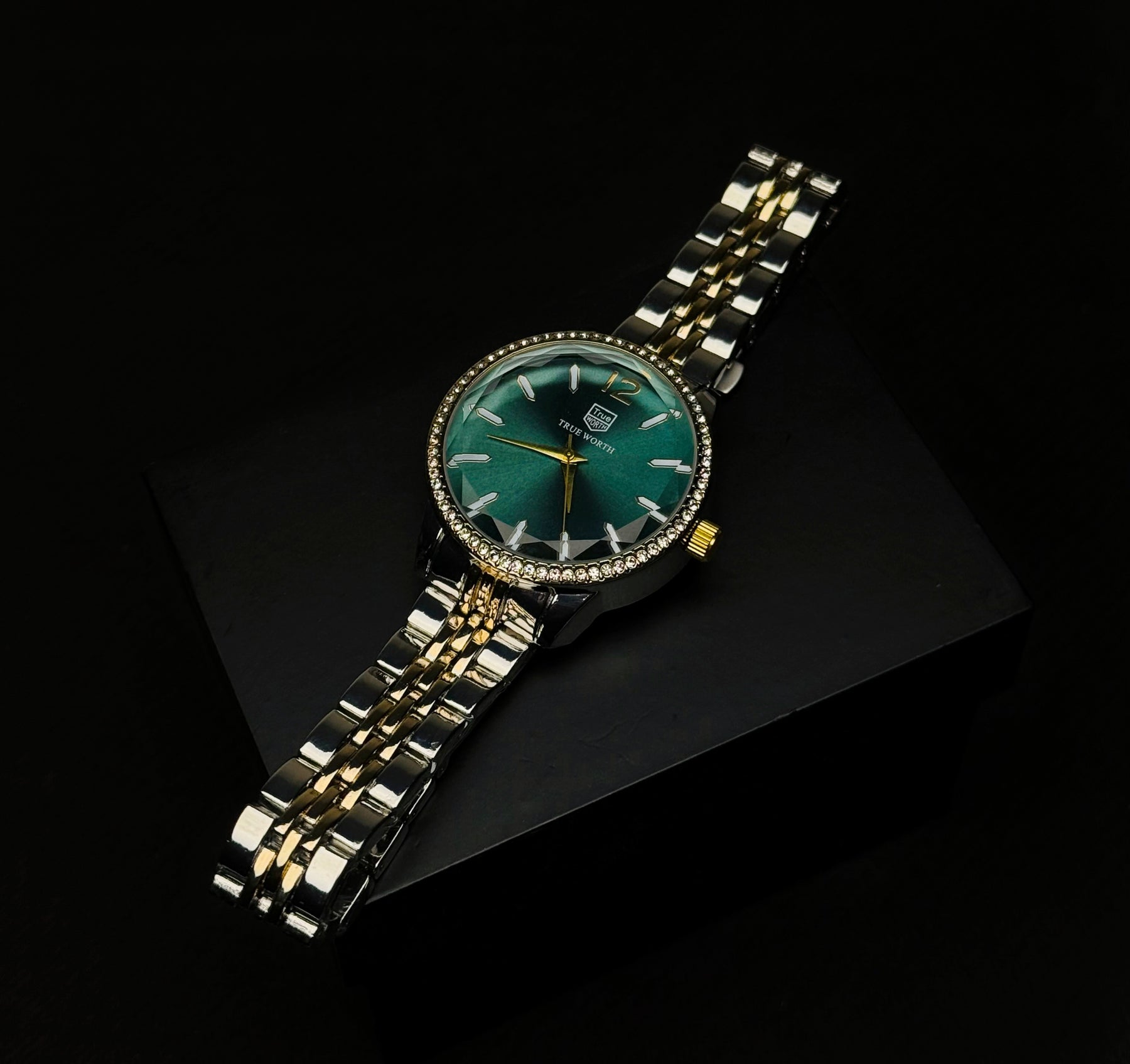 This watch features a mesmerizing emerald green dial that exudes depth and sophistication, reminiscent of precious jewels. This rich hue is beautifully framed by a radiant bezel lined with sparkling crystals, creating an enchanting halo effect. Completed with polished silver and warm 22k gold accents, this is your new signature timepiece. 🎀
