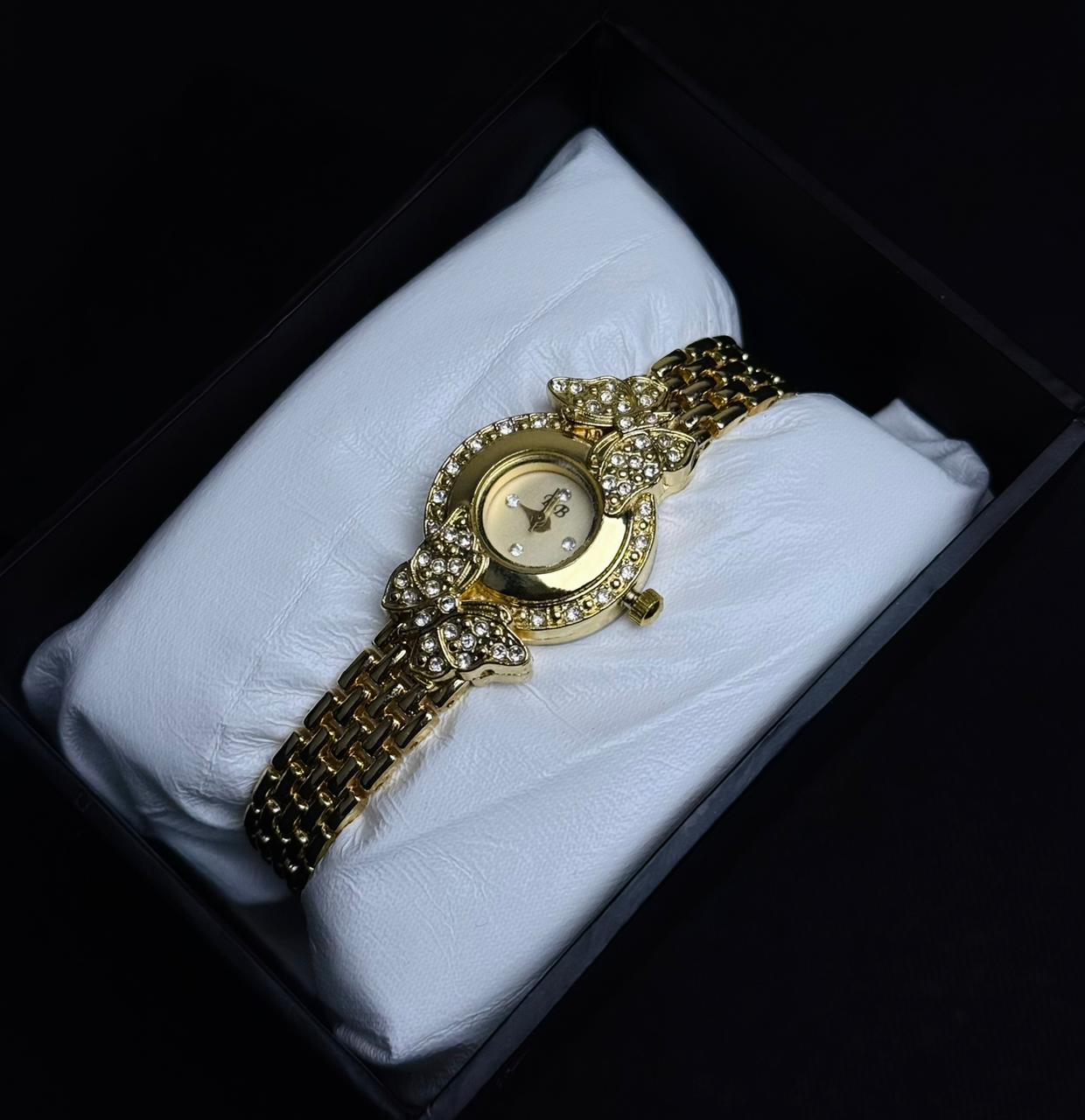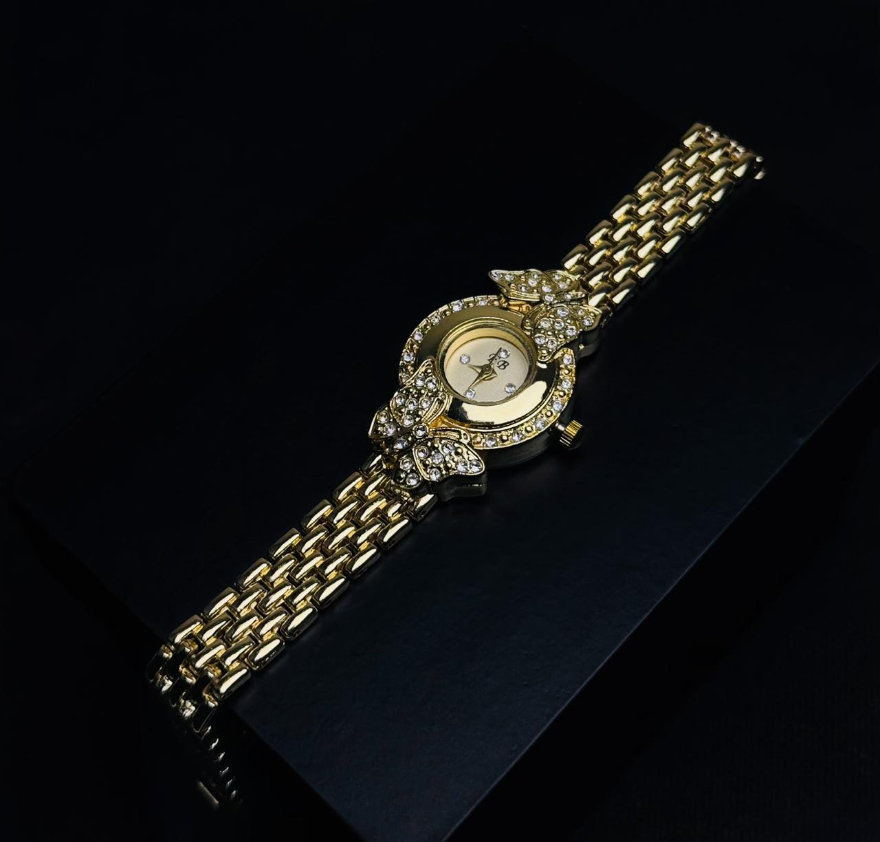 It's not just a watch; it's a wearable piece of jewelry designed to elevate every outfit, from business casual to evening wear. The bezel is intricately adorned with sparkling simulated diamonds shaped into graceful butterflies, creating a unique and captivating frame for the petite golden dial. The classic, sleek bracelet rests beautifully on the wrist, offering both the shine of a fine gold piece and the reliability of a high-quality timepiece. The Timepiece comes with A 2 Years Money Back Wear Warranty 💯 Premium Packaging 💯 Pure 22k Gold Plated 💯 Finest Glass Dial 💯 Easily Adjustable Straps for everyone 💯