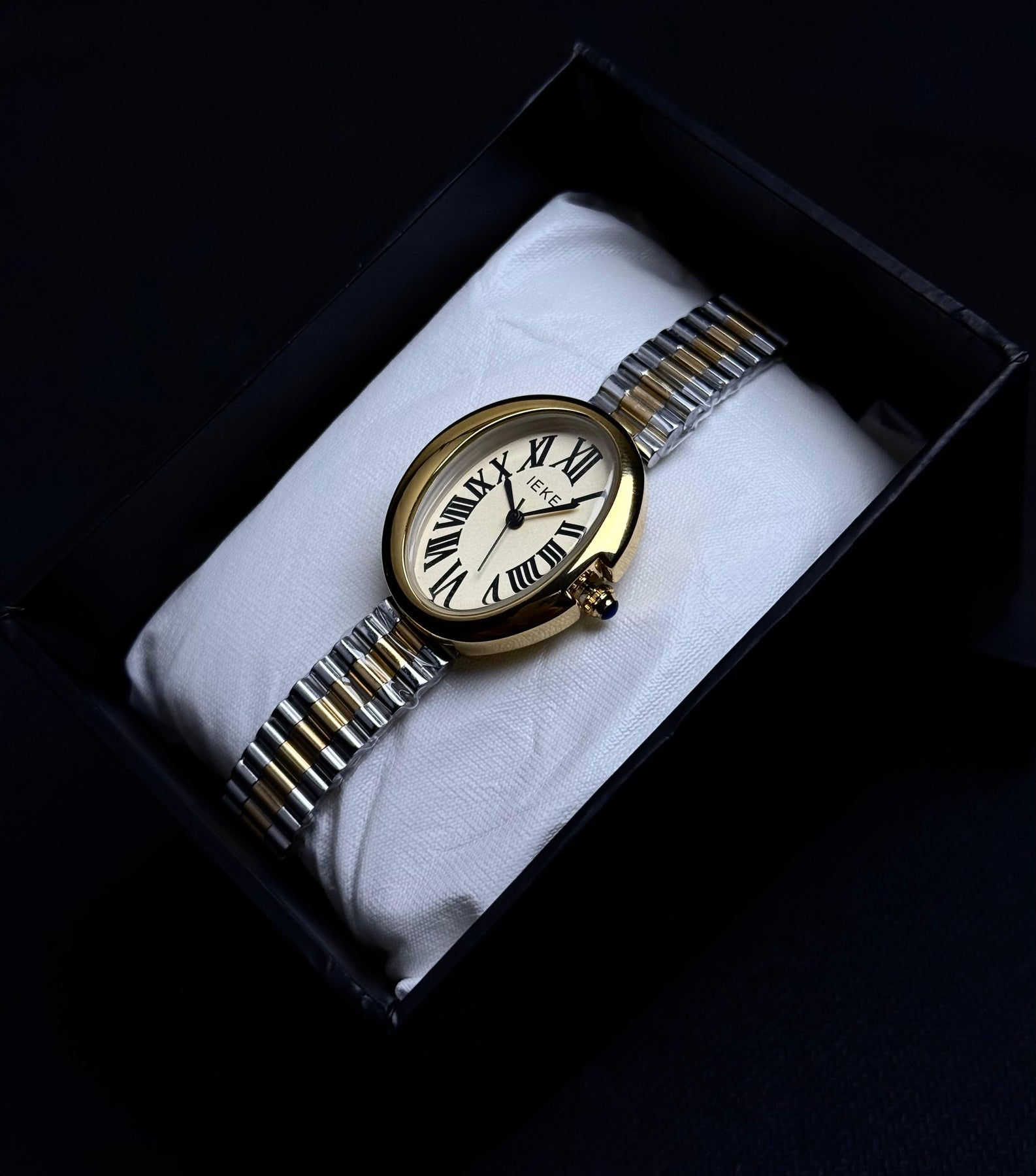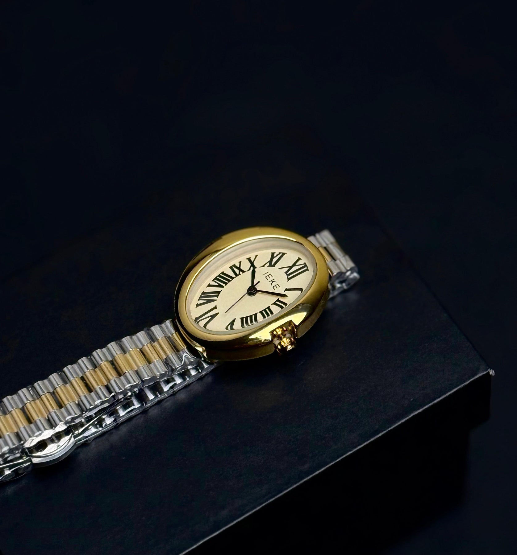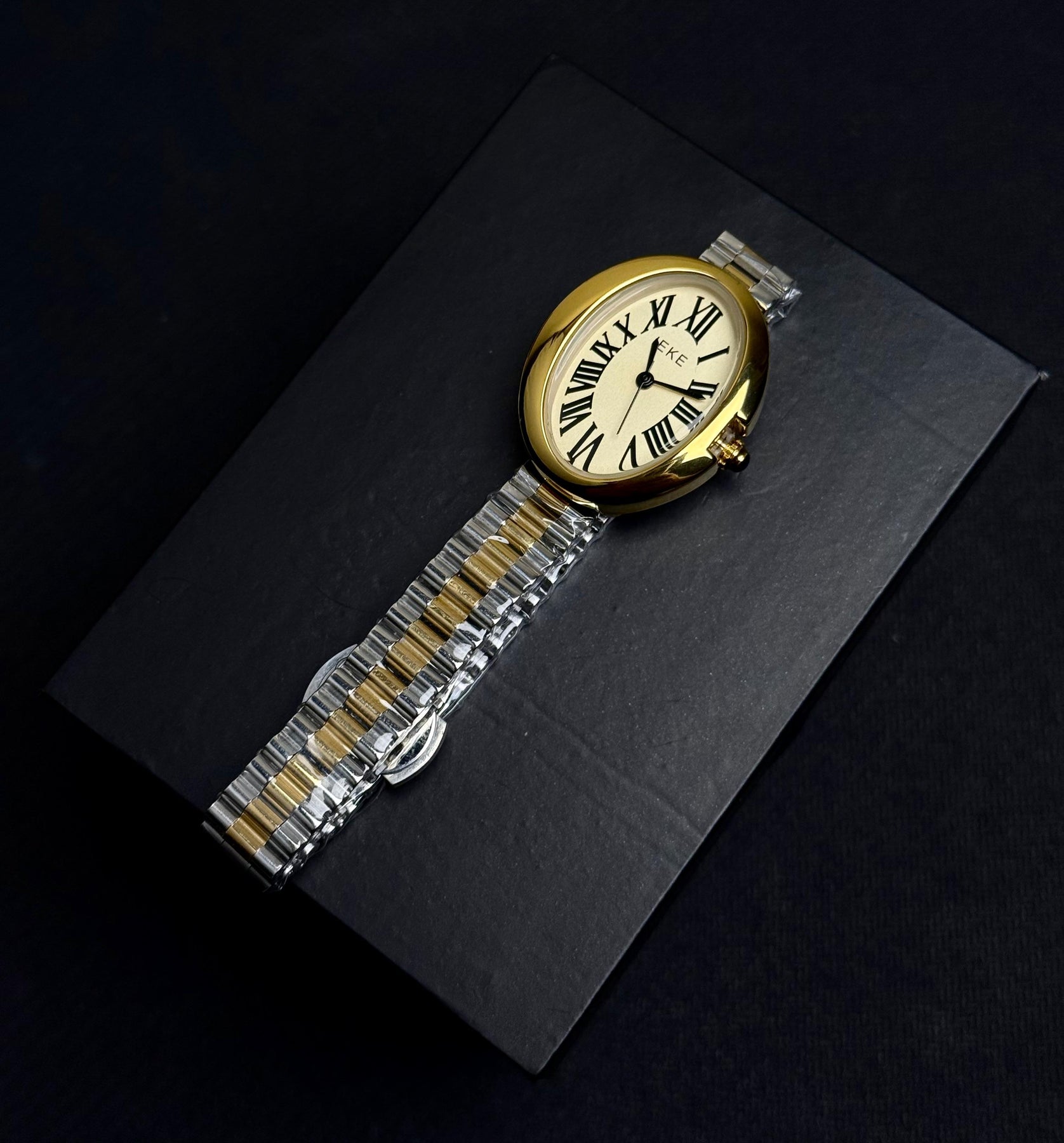 Case: Elegant Oval Shape, High-Polish Gold-Tone Finish