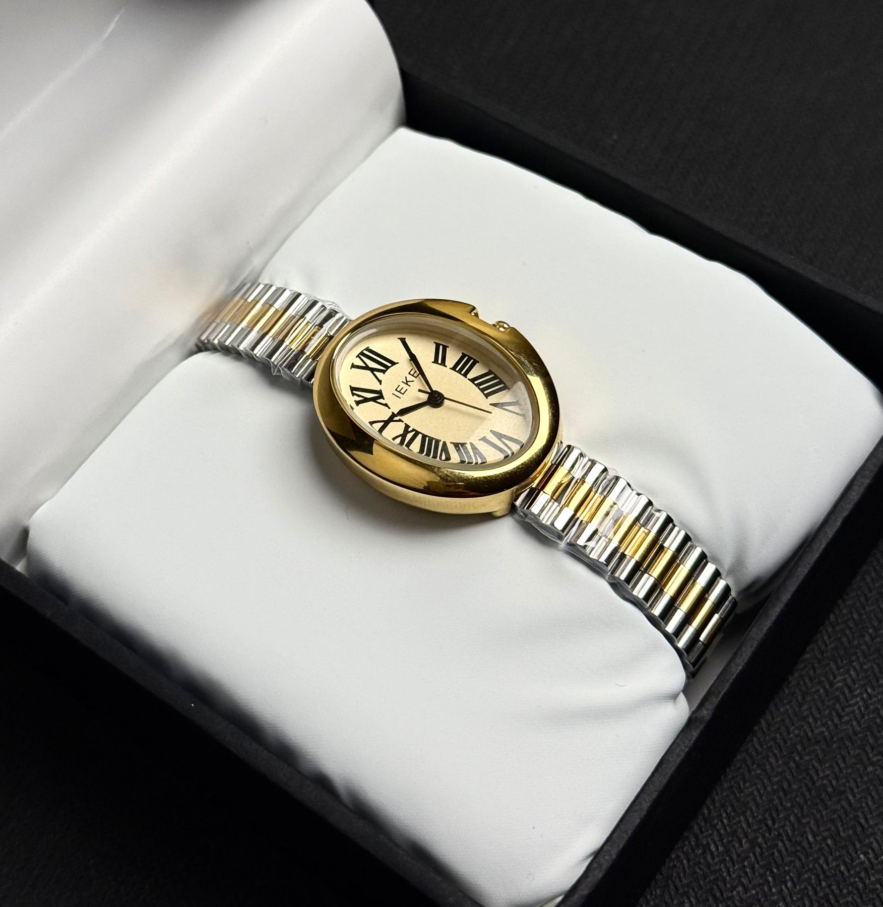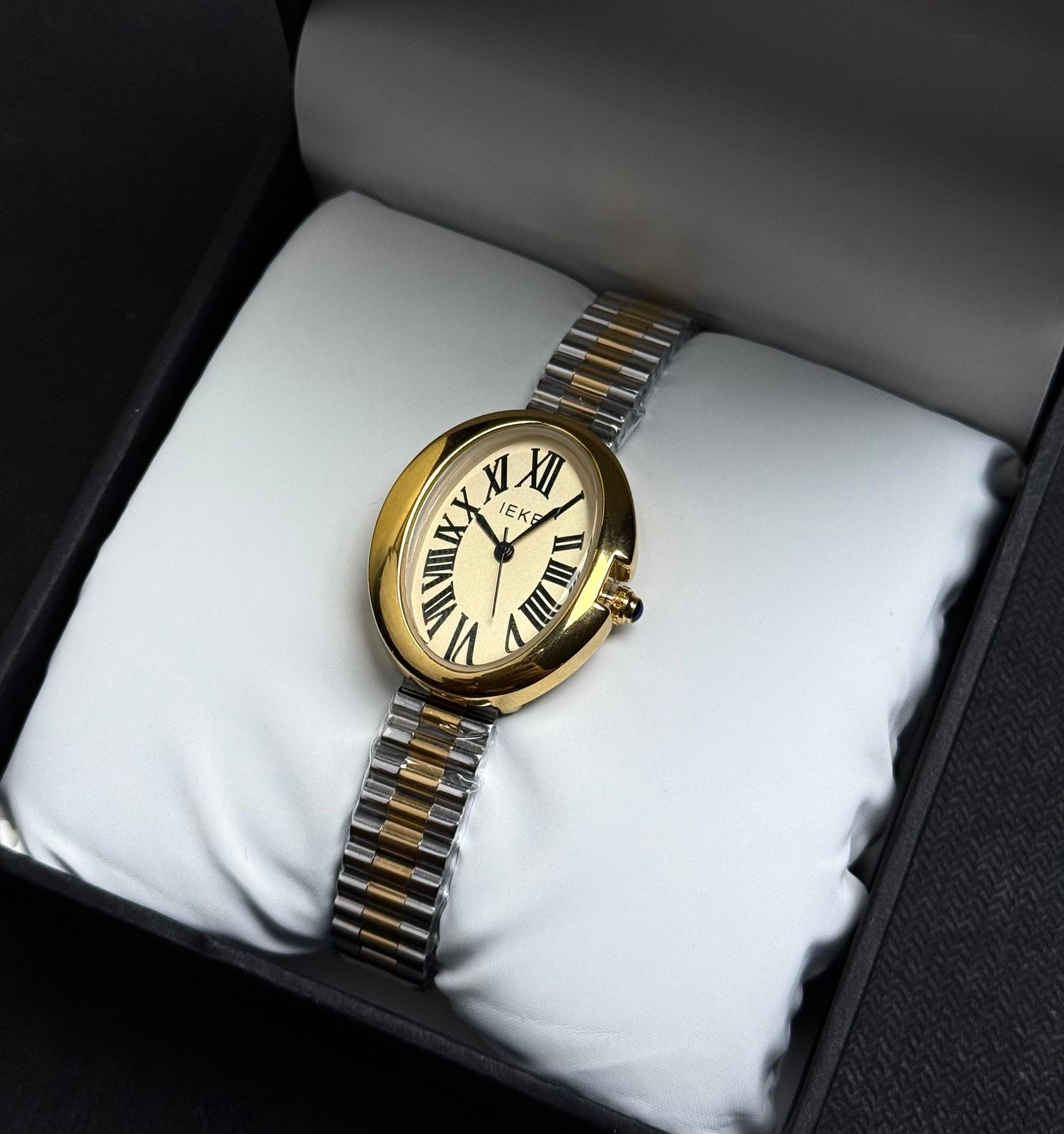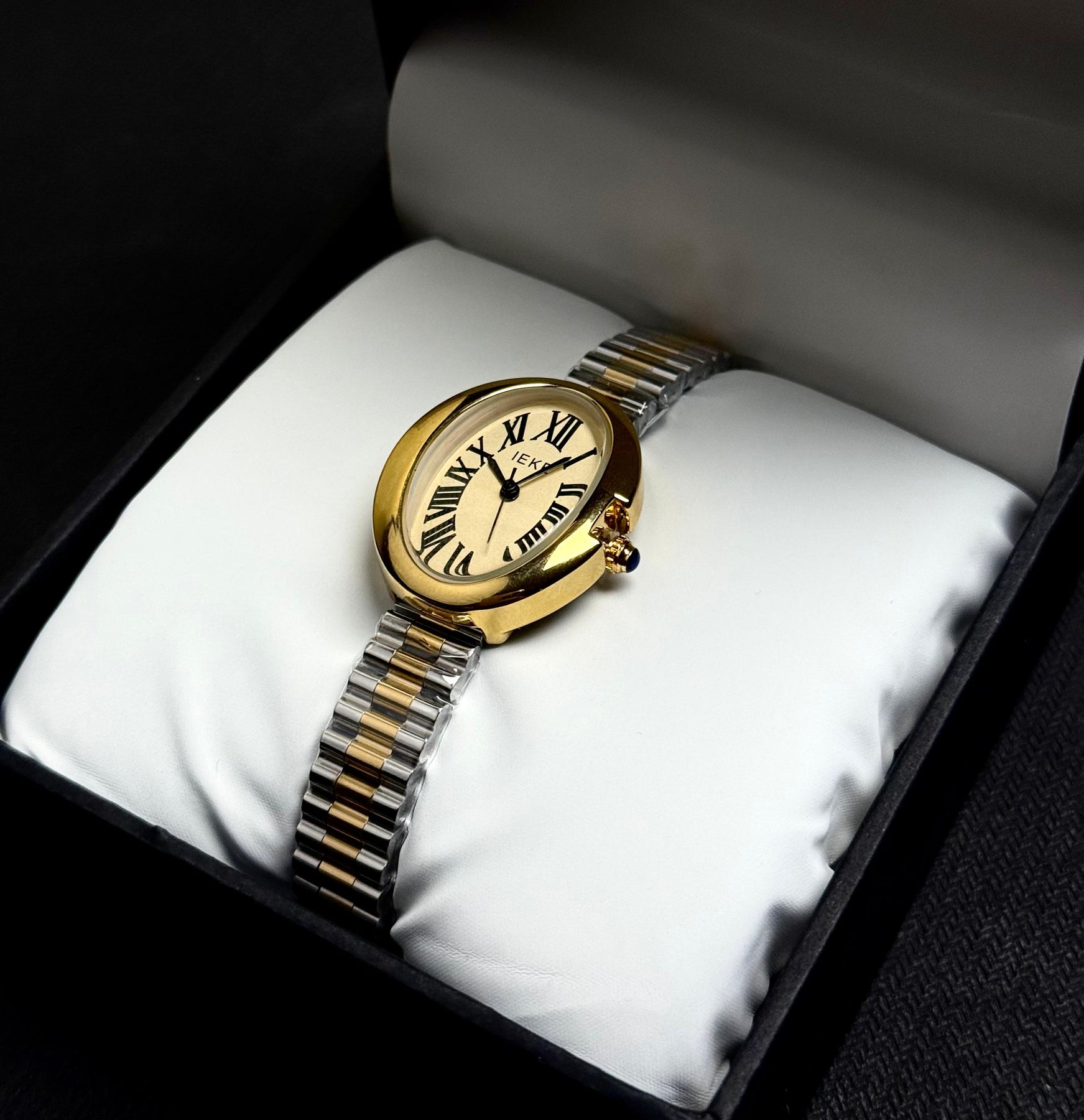 Case: Elegant Oval Shape, High-Polish Gold-Tone Finish