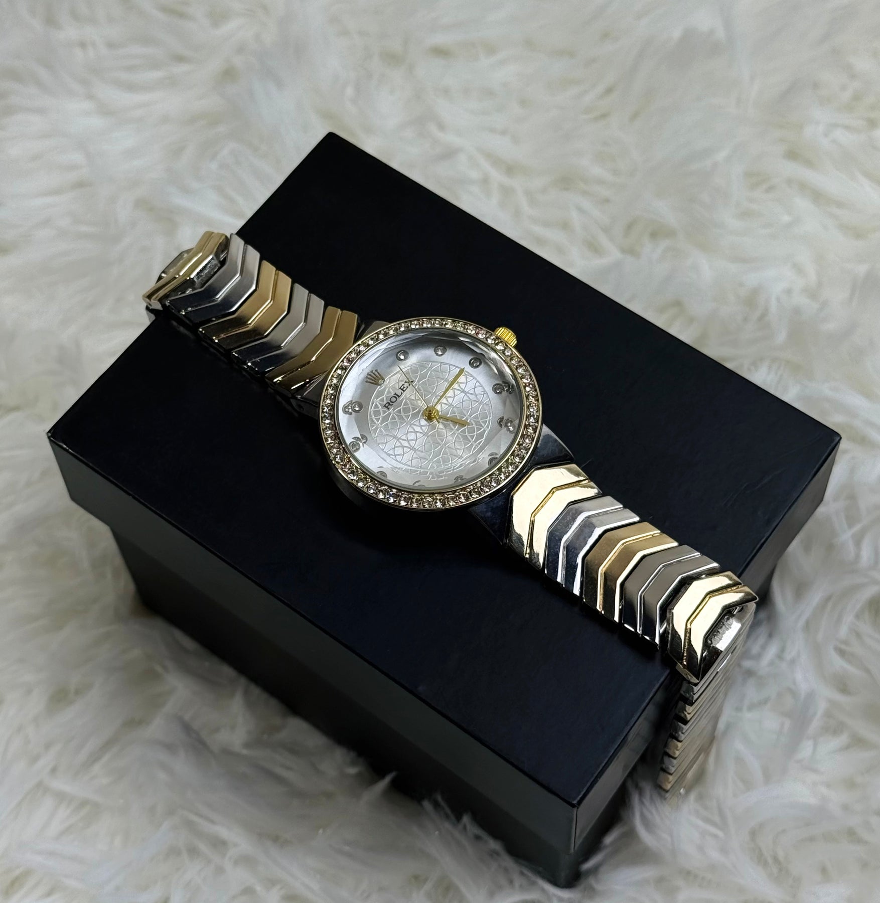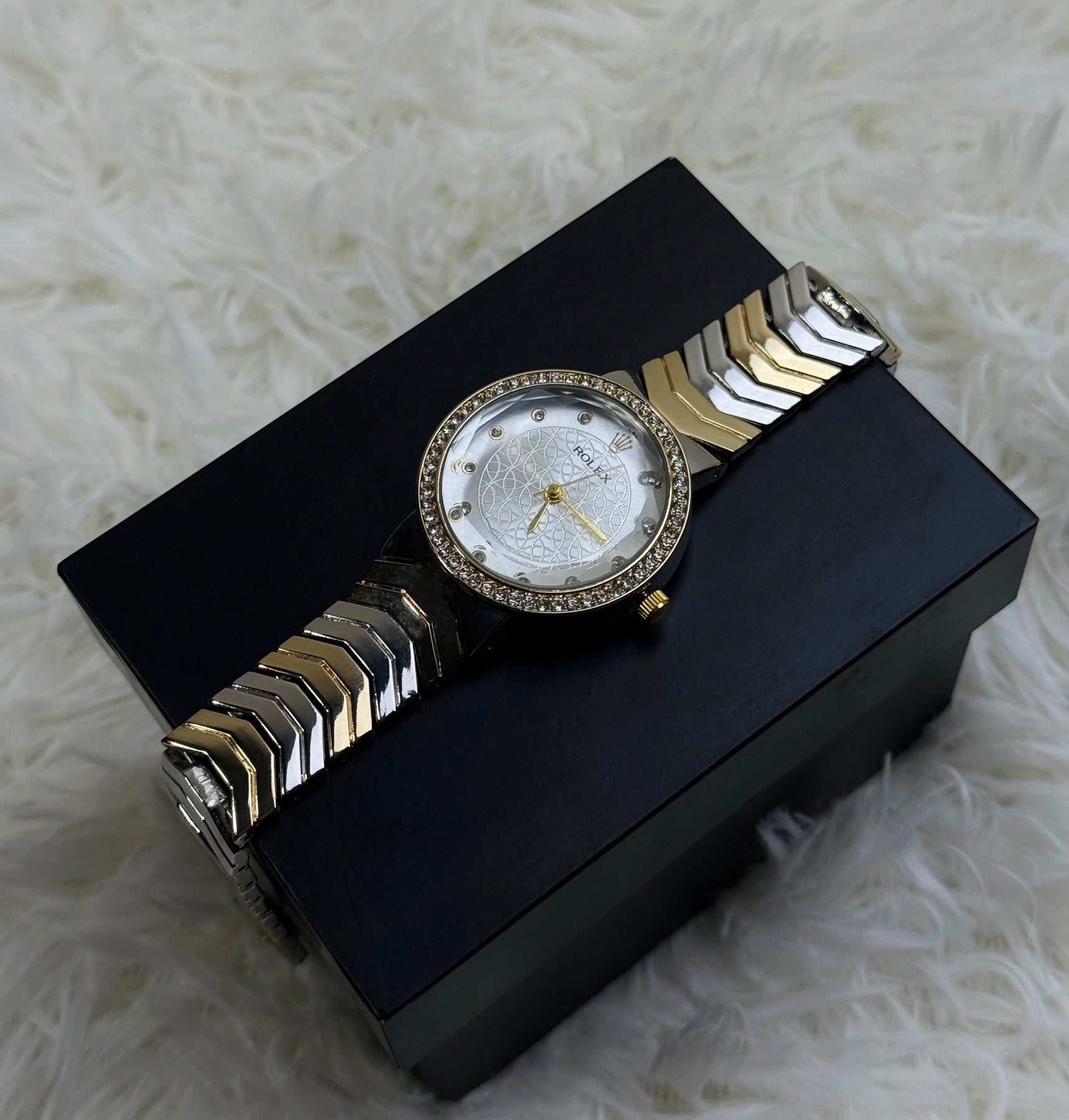 Make a statement that shines. This stunning timepiece is crafted for the modern woman who embraces bold sophistication. Its striking rectangular silver case intricately textured bezel, and luminous mother of pearl dial exudes  luxury. The refined silver link bracelet completes a look that transitions seamlessly from power meetings to glamorous evenings