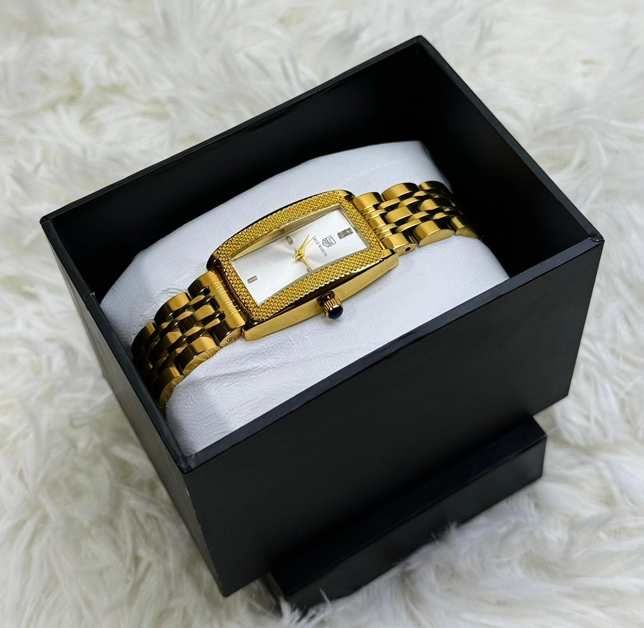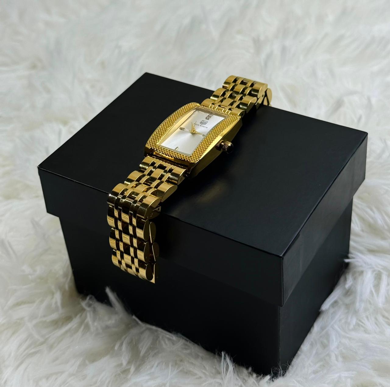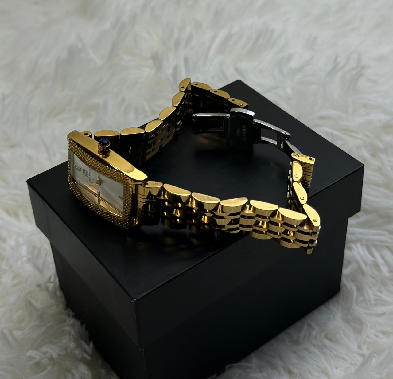 Make a statement that shines. This stunning timepiece is crafted for the modern woman who embraces bold sophistication. Its striking rectangular gold case, intricately textured bezel, and luminous mother-of-pearl dial exudes luxury . The refined gold link bracelet completes a look that transitions seamlessly from power meetings to glamorous evenings
