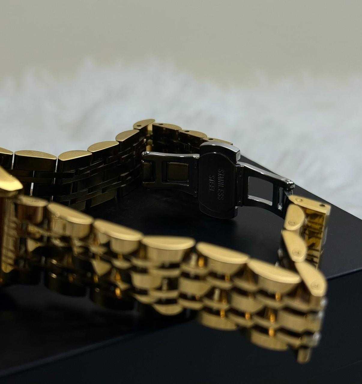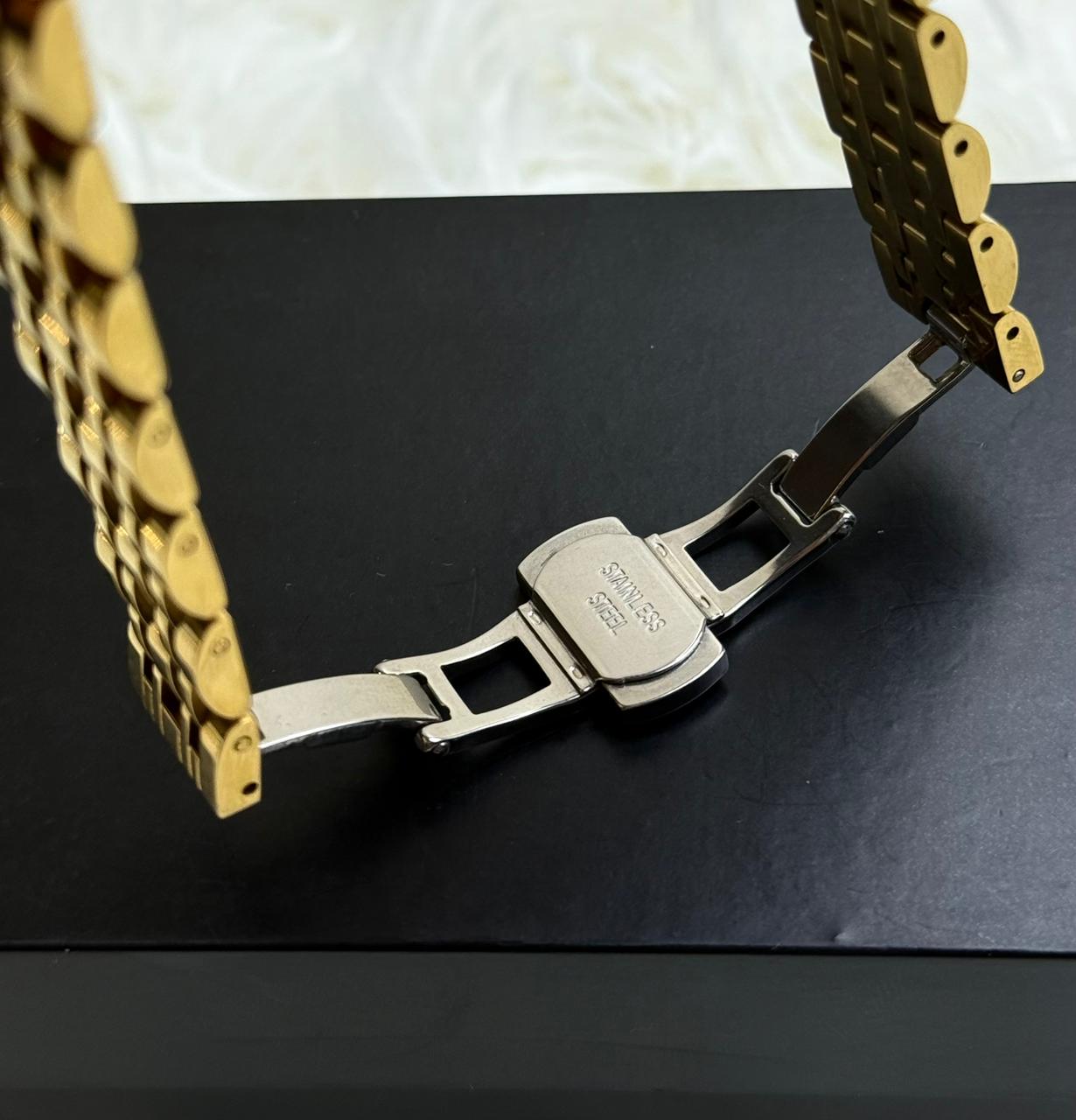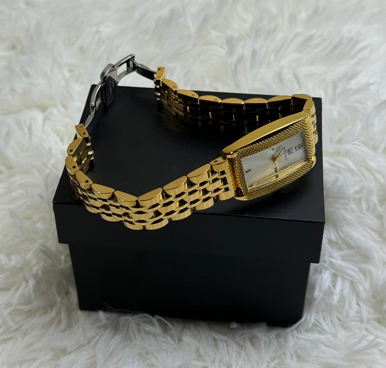 Make a statement that shines. This stunning timepiece is crafted for the modern woman who embraces bold sophistication. Its striking rectangular gold case, intricately textured bezel, and luminous mother-of-pearl dial exudes luxury . The refined gold link bracelet completes a look that transitions seamlessly from power meetings to glamorous evenings