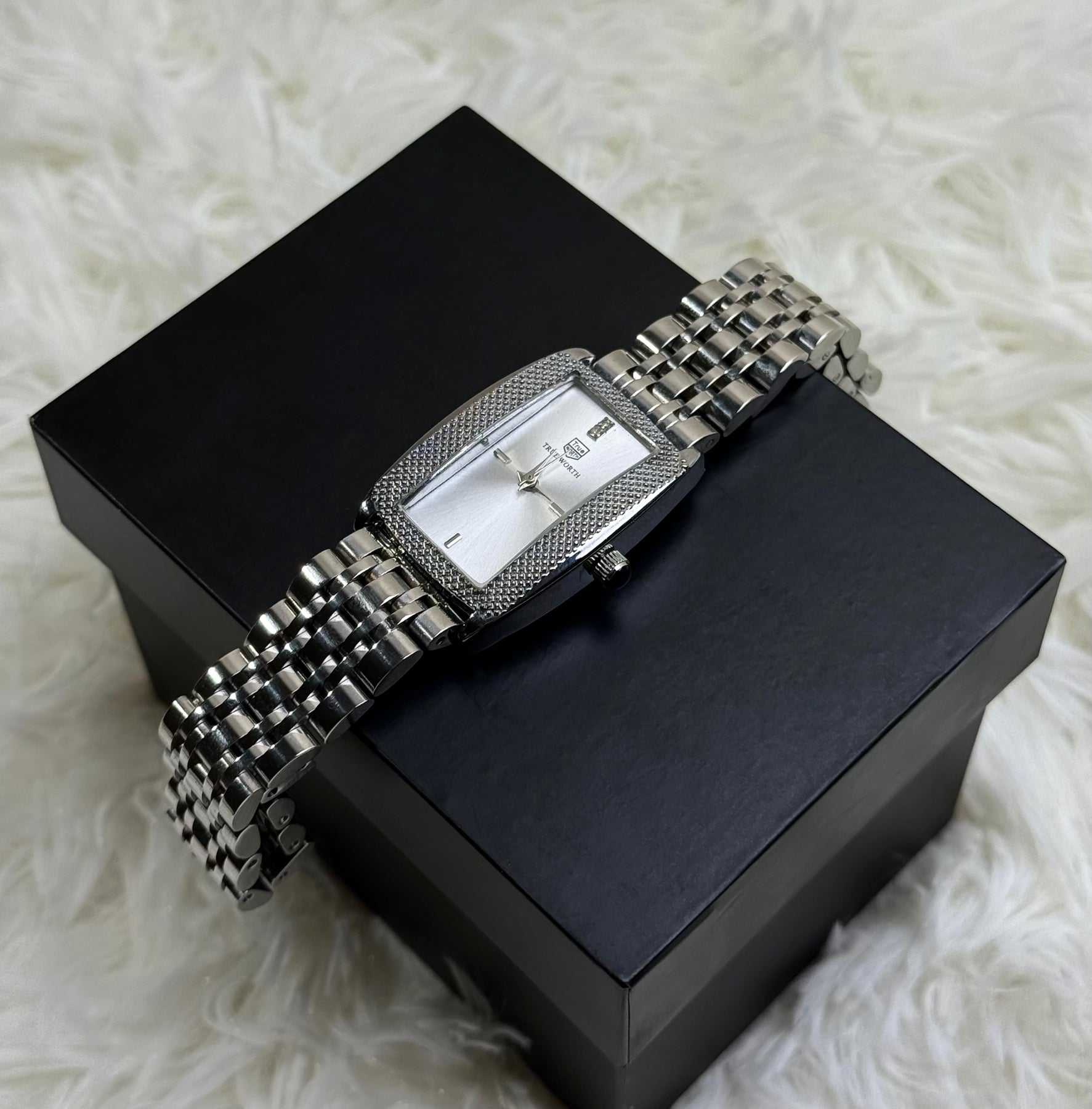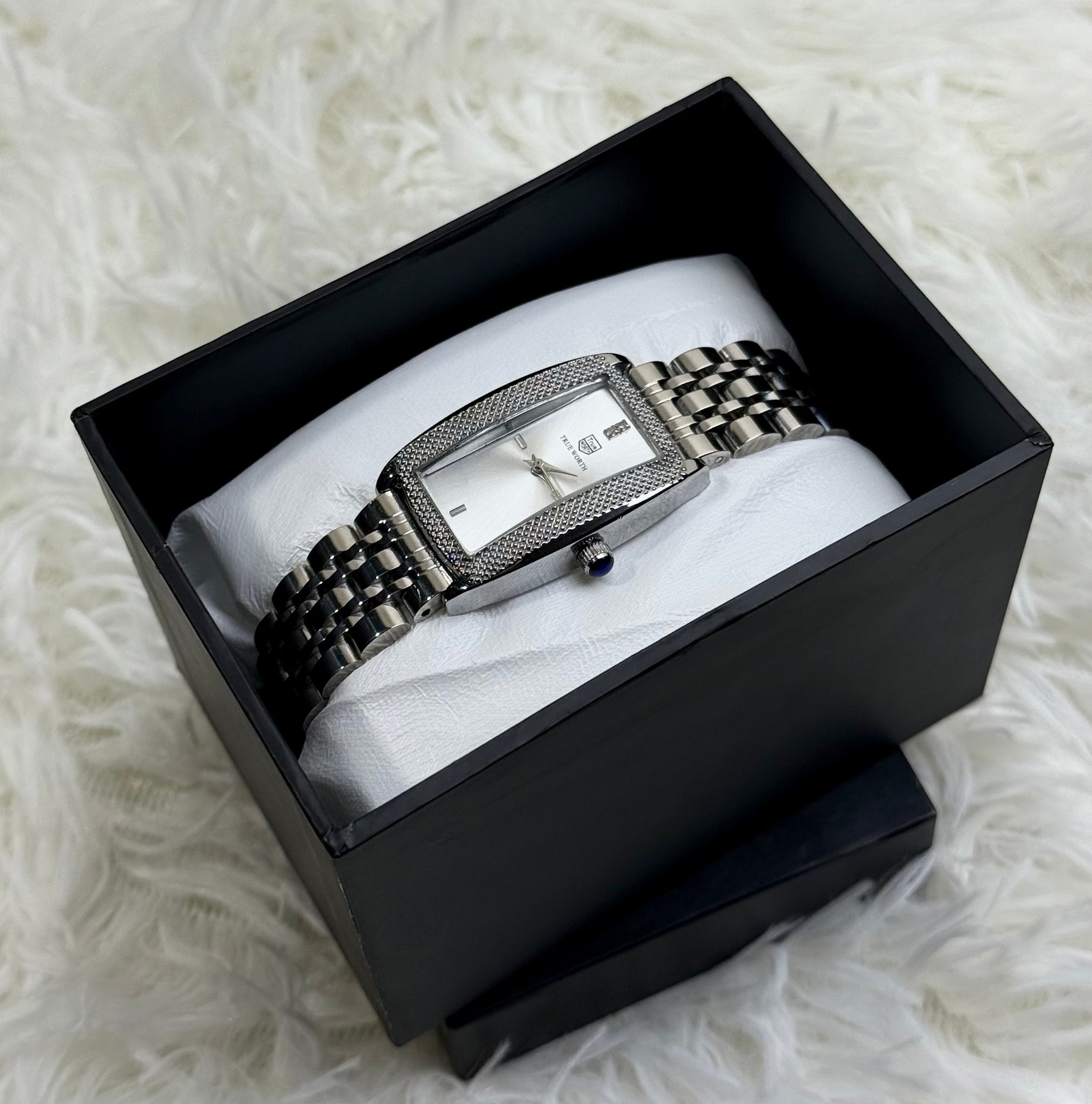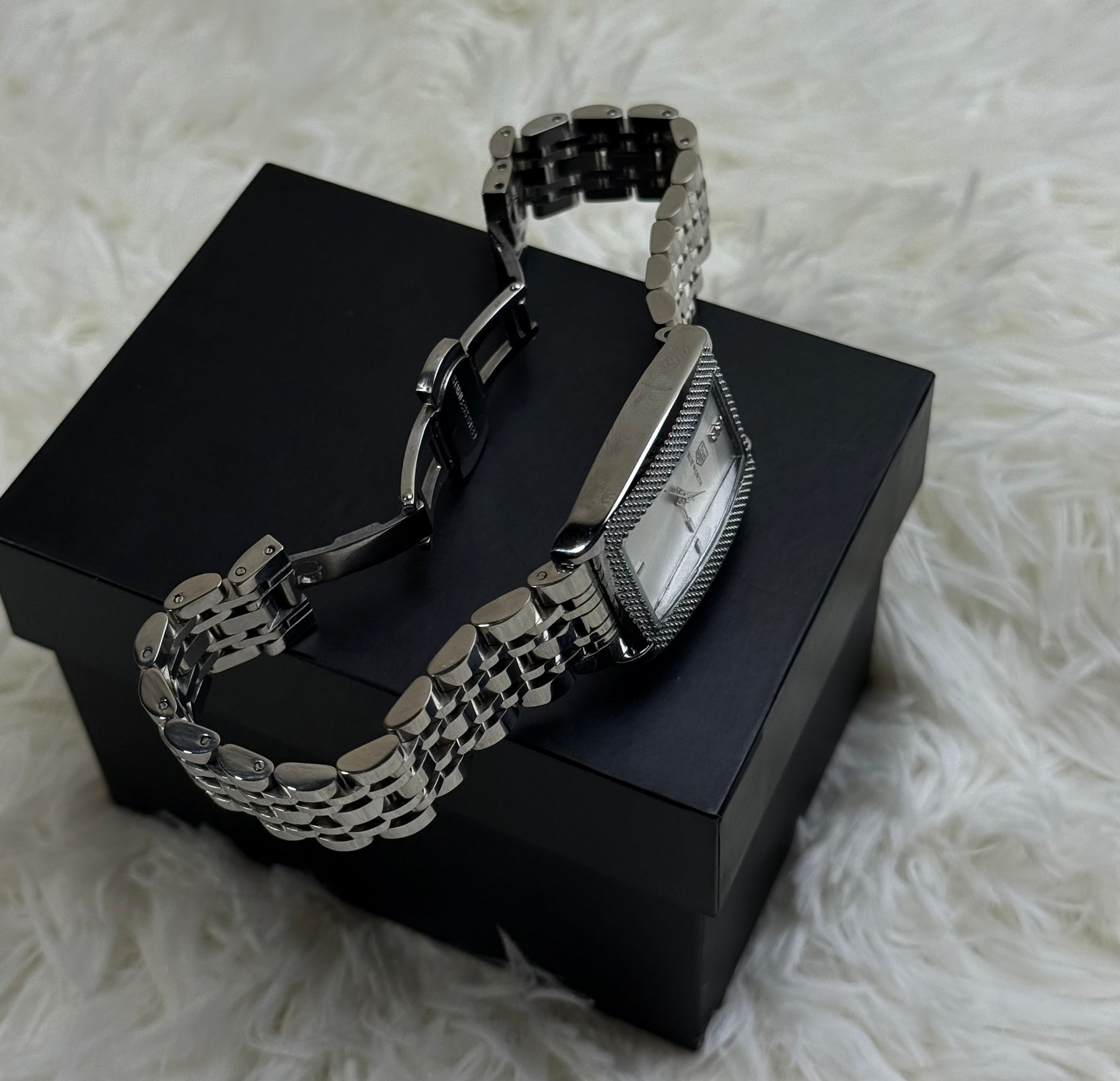 Make a statement that shines. This stunning timepiece is crafted for the modern woman who embraces bold sophistication. Its striking rectangular silver case intricately textured bezel, and luminous mother of pearl dial exudes  luxury. The refined silver link bracelet completes a look that transitions seamlessly from power meetings to glamorous evenings