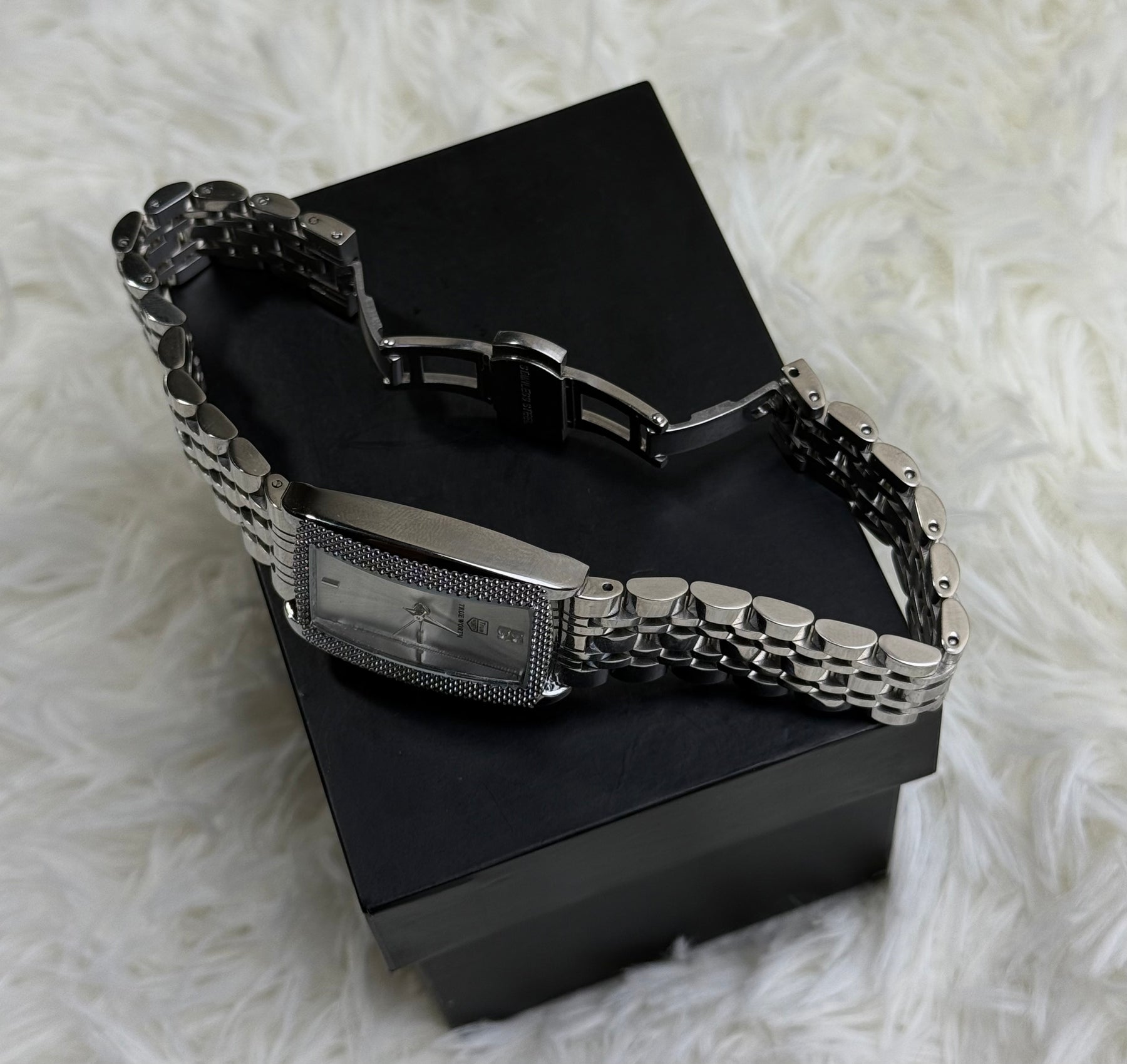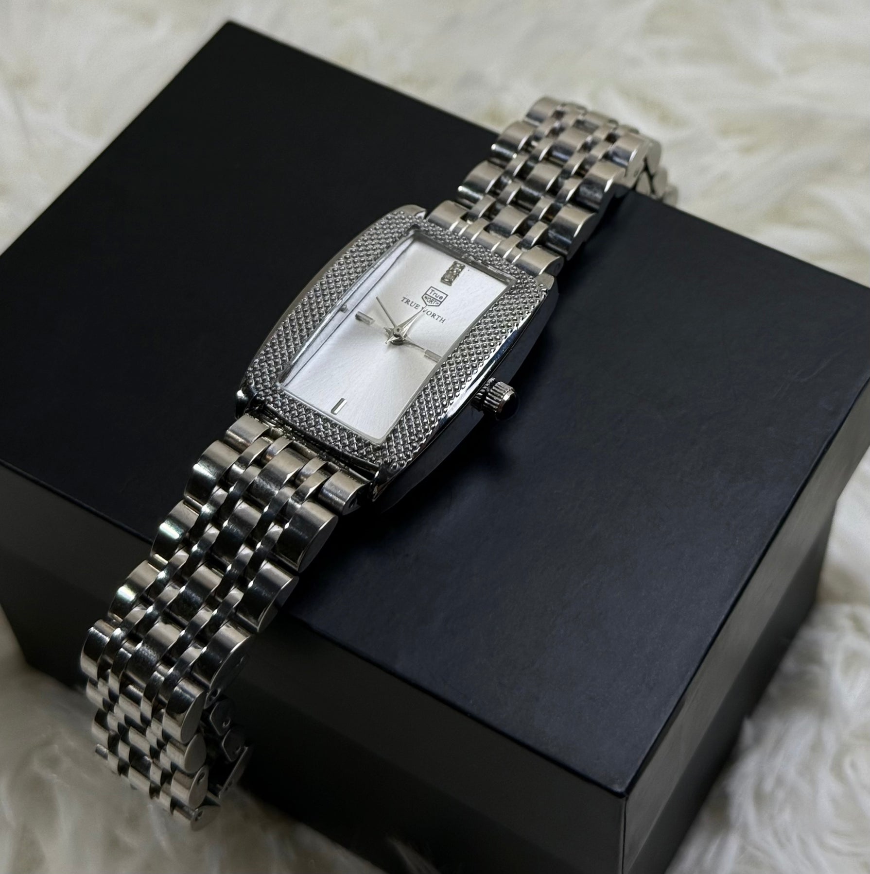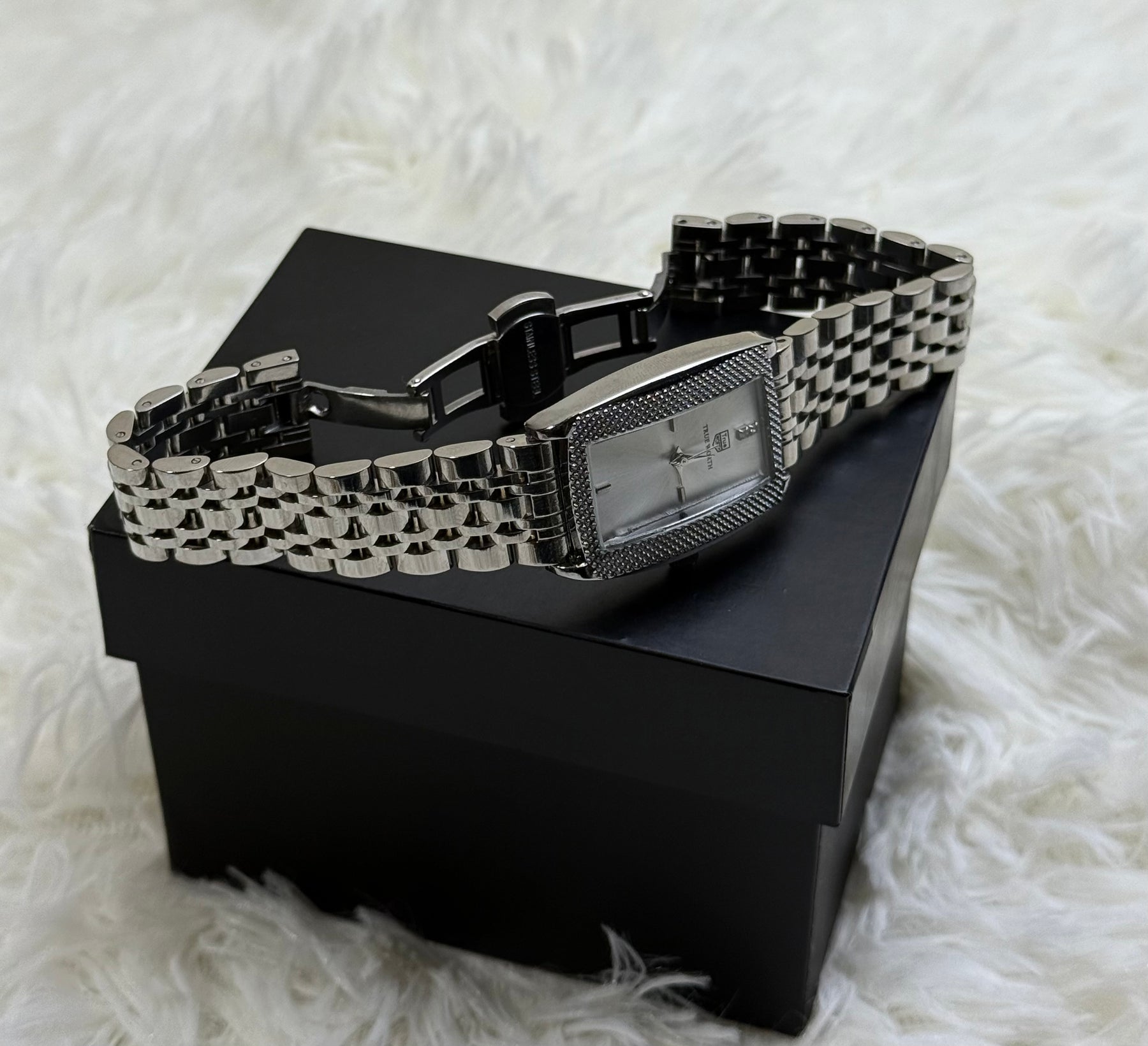 Make a statement that shines. This stunning timepiece is crafted for the modern woman who embraces bold sophistication. Its striking rectangular silver case intricately textured bezel, and luminous mother of pearl dial exudes  luxury. The refined silver link bracelet completes a look that transitions seamlessly from power meetings to glamorous evenings